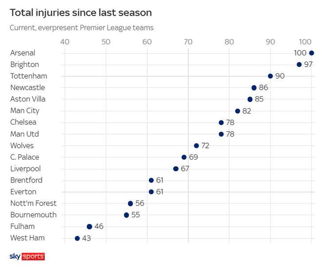 本-懷特在對陣狼隊的上半場比賽中因傷退場,這也讓阿森納成為過去兩個賽季英超首支傷病次數突破百次的球隊,無奈登頂傷病榜首位。布萊頓以97次傷病位居第二,阿森納的北倫敦死敵熱刺則以90次傷病排名第三。